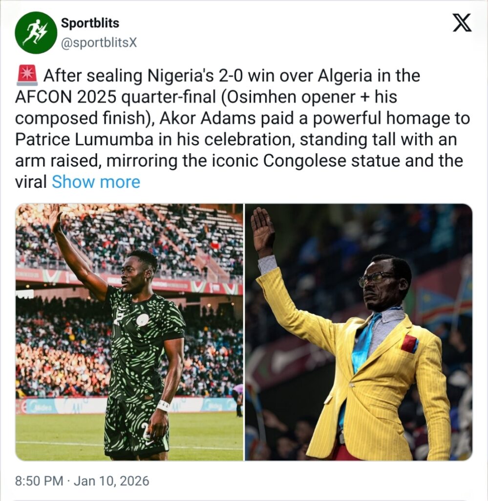 What a moment of pure class and symbolism! After Victor Osimhen broke the deadlock in the 47th minute, Akor Adams sealed Nigeria’s 2-0 quarter-final triumph over Algeria at AFCON 2025 with a composed finish in the 57th minute – assisted brilliantly by Osimhen himself. But it was Adams’ celebration that stole the show: the Sevilla forward stood tall, raised his right arm, and mirrored the iconic pose of Patrice Lumumba, the legendary Congolese independence leader – exactly like the viral DR Congo superfan Michel Nkuka Mboladinga (“Lumumba Vea”) who became one of the tournament’s biggest sensations.