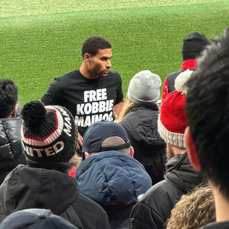 In a touching show of support, Kobbie Mainoo’s brother was spotted at Old Trafford donning a ‘Free Kobbie Mainoo’ T-shirt.